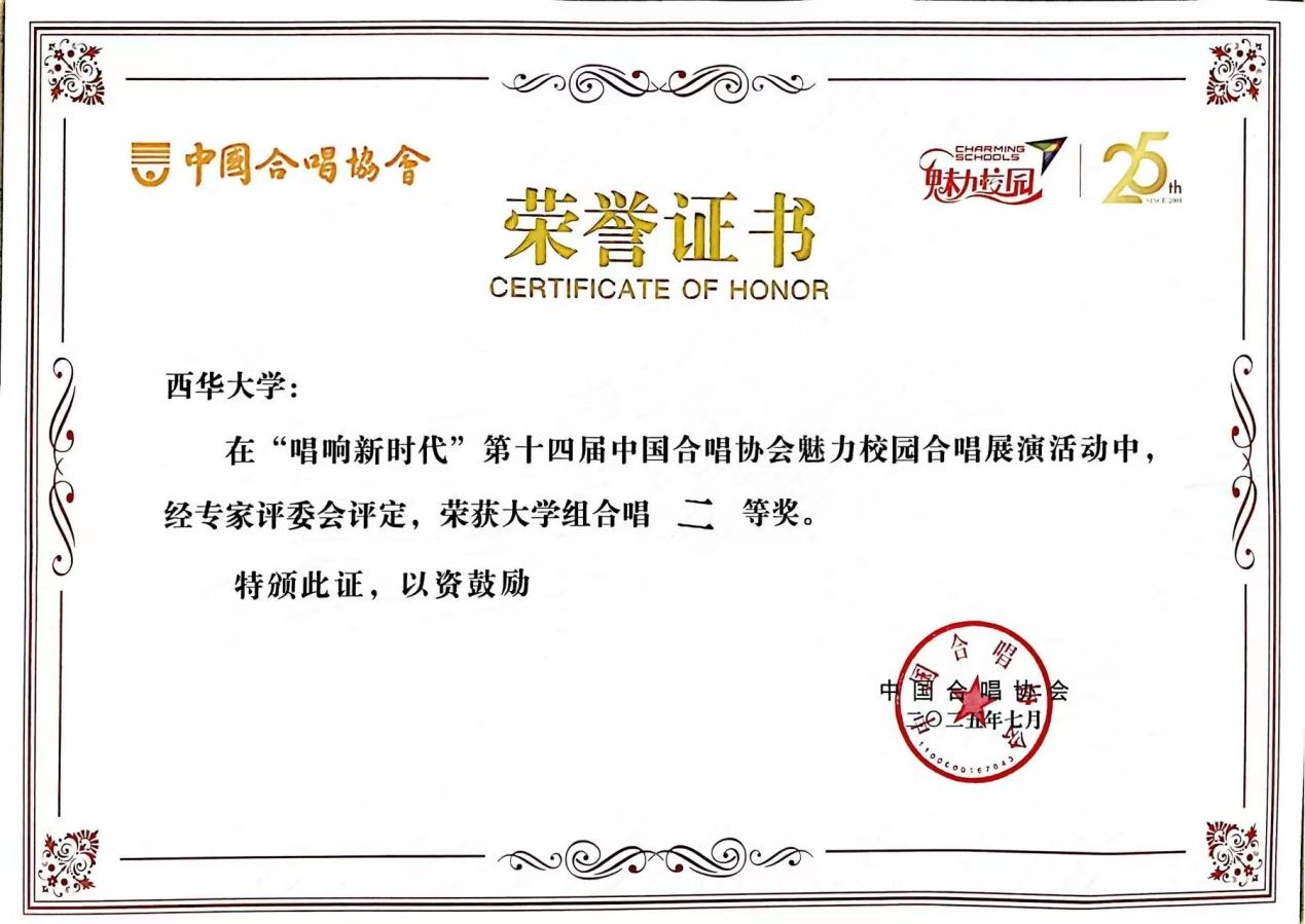 7月18日—20日,“唱响新时代”中国合唱协会第十四届魅力校园合唱展演在成都城市音乐厅举办。这场聚焦校园合唱的盛会吸引了来自全国各省(市)、自治区的75支合唱团,3000余名师生齐聚成都,唱响青春乐章,用歌声祝福祖国。在本次展演活动中,西华大学获评优秀组织单位奖,音乐与舞蹈学院四个团队分别在合唱、声乐组合、小合唱、表演唱组别中斩获一等奖1项,二等奖3项。