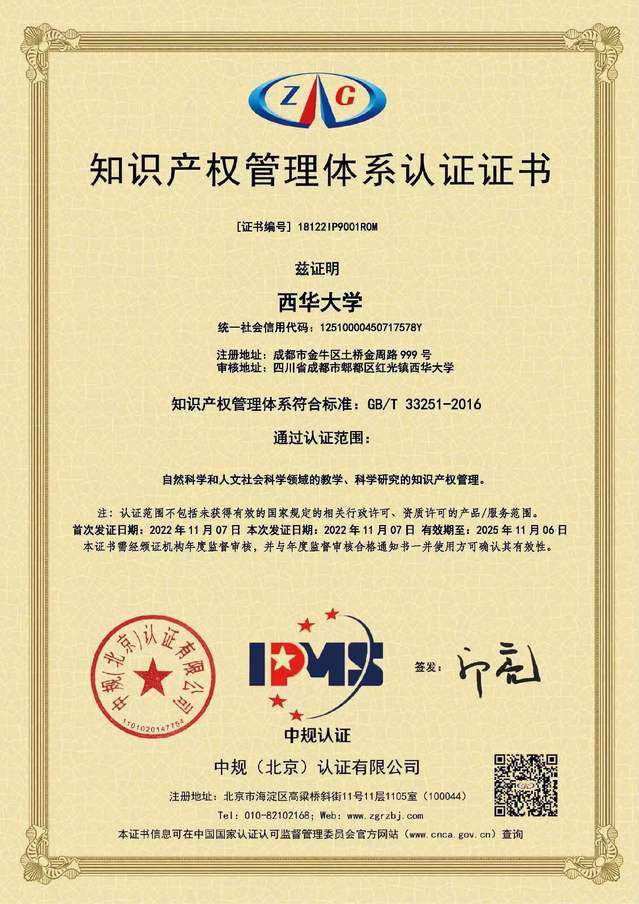 “光明日报客户端”11月9日以“西华大学通过知识产权‘贯标’认证”为题作了报道。报道全文如下:11月7日,西华大学知识产权贯标通过《高等学校知识产权管理规范》国家标准审核认证,并取得了中规(北京)认证有限公司颁发的认证证书。2016年,《高等学校知识产权管理规范》(GB/T33251-2016)发布后,教育部和国家知识产权局分别发出通知要求,对符合条件的高校分期分批进行贯彻知识产权管理规范的实施,简称“贯标”。2020年,西华大学入选国家知识产权试点高校、成都市高价值专利培育中心。学校2021年启动知识产权“贯标”工作,设立先进技术转移与转化办公室,分批次组织开展知识产权贯标培训,对标《高等学校知识产权管理规范》内容,查漏补缺。今年10月,中规(北京)认证有限公司派出3位专家组成认证专家组进驻西华大学,通过审核材料、调研取证、查阅档案文件、组织座谈和跟踪审核等方式,审核组对照标准条款认真审阅了有关材料并详实记录,提出了改进意见和建议。最终,西华大学于11月7日顺利通过认证机构终审并获得认证证书。据悉,西华大学新编制了知识产权管理手册、知识产权管理制度、信息检索分析控制程序、知识产权控制