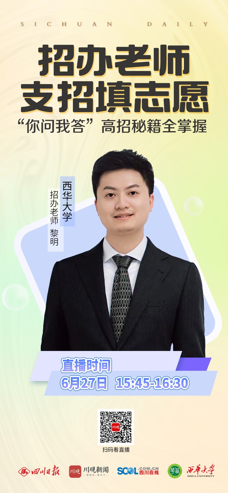 6月26日上午10:10,成都人民广播电台新闻广播教育互动节目《超级家长会》“大学招办面对面”栏目邀请我校大健康管理学院院长李玲、招生与就业处副处长黄潇做客直播间,对学校的基本情况及今年的招生政策作了介绍。该节目开通了音视频直播,音频节目在成都人民广播FM99.8上播出,视频在《超级家长会》视频直播区和视频号播出。黄潇主要介绍了学校的基本情况、2022年招生政策、毕业生就业及去向情况,并介绍了学校的热门专业、新增专业以及艺体类专业情况。李玲主要介绍了大健康管理学院的情况及大健康行业发展趋势,以及大健康管理学院各专业近年来的收分情况。节目海报视频回放请点击以下链接:https://appd0o6hypv1939.h5.xiaoeknow.com/v2/course/alive/l_62aad2a7e4b06accb06e05c3?app_id=appd0o6hypv1939available=trueentry=2entry_type=2002pro_id=p_629eb46ae4b01c509aba4cb2scene=%E5%88%86%E4%BA%ABshare_scene=1sha