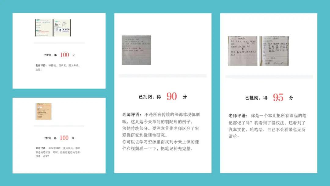 课后,我将课件、讲课视频都上传到平台上供学生复习和纠错,并认真地批阅了学生的作业,并对笔记上有问题的地方一一给出了修改建议。无法面授的情况下,课堂笔记还是可以很直观地反应出学生的听课情况,有的笔记还给了我惊喜。