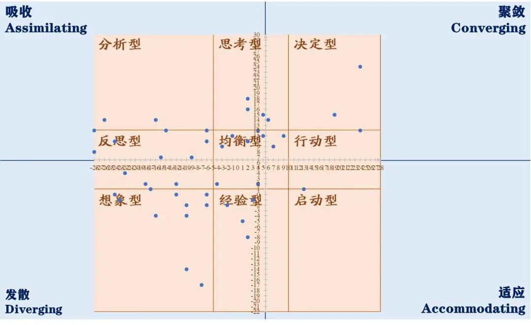 (图中的蓝点就是每个学生通过测试确定的坐标,他们可以通过四象限和九宫格定位自己的风格)