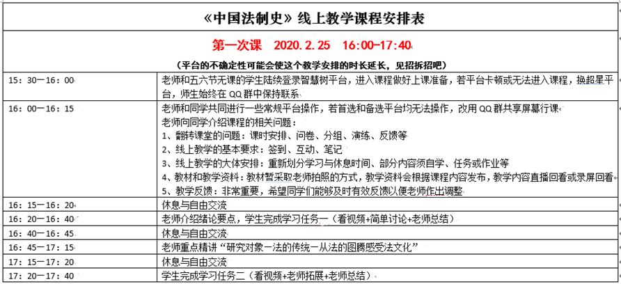 如果没有发生疫情,我这学期其实也是准备在我的《中国法制史》课上尝试全面的线上线下混合式教学的,上学期已经提交了申请,并进行了一些设计。寒假里,疫情的迅速蔓延一度让我感到无措,因为很多事情变得不确定,直到收到学校的通知:按计划开学,全面开展线上教学。一方面是因为本有准备,另一方面是因为终于有一件确定的可以如期进行的事,我带着期待多于紧张的心情开启了我的线上教学之旅。