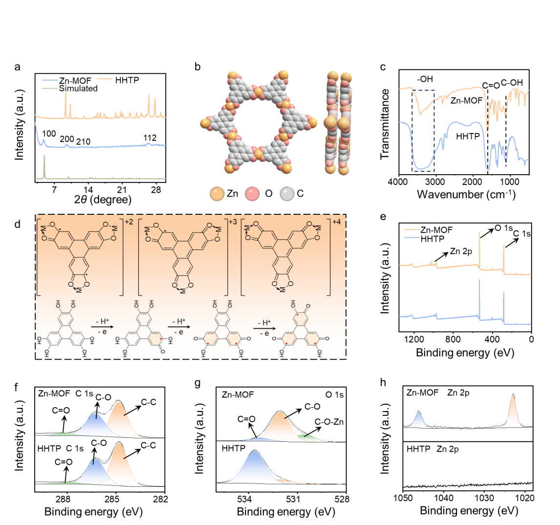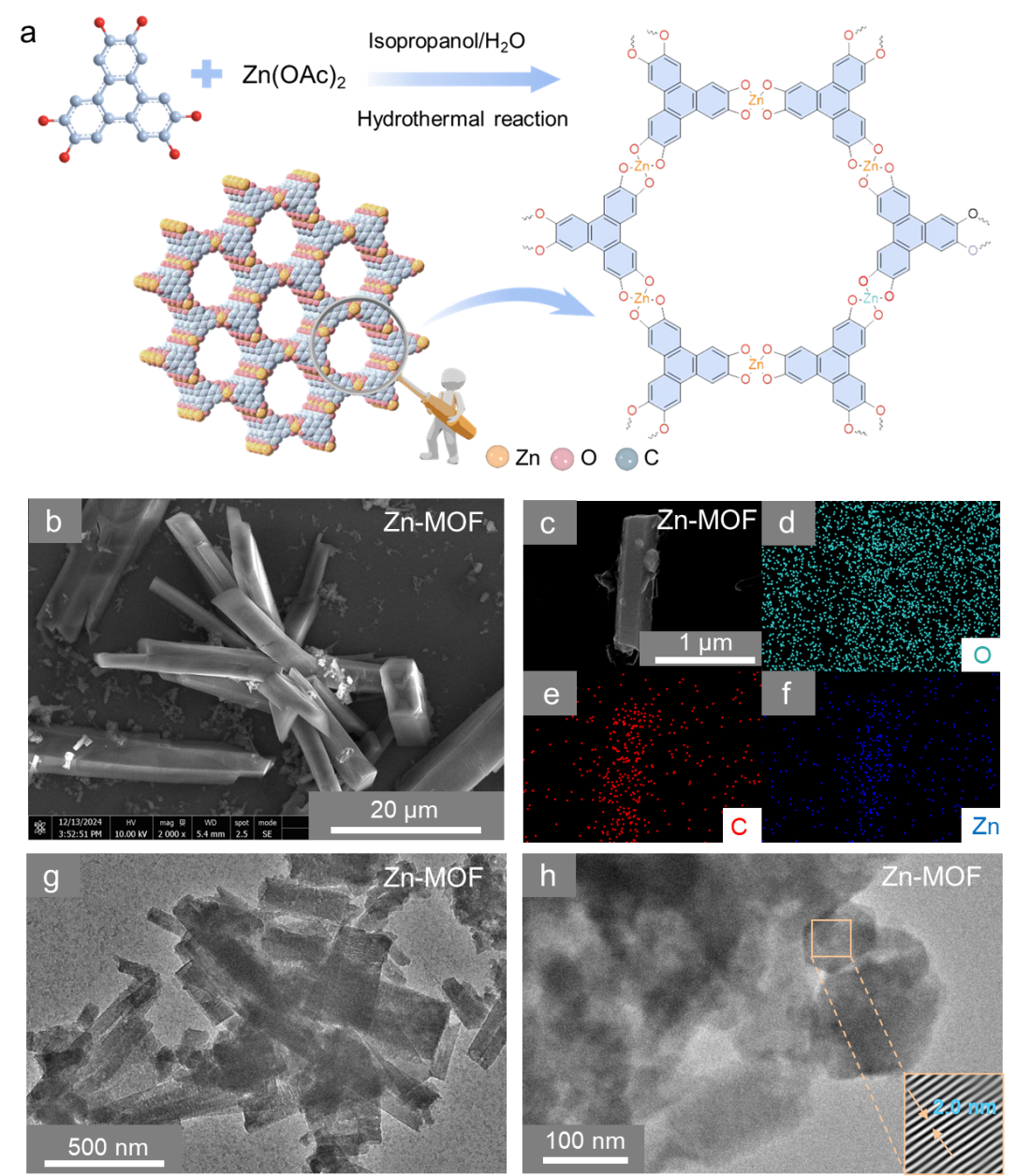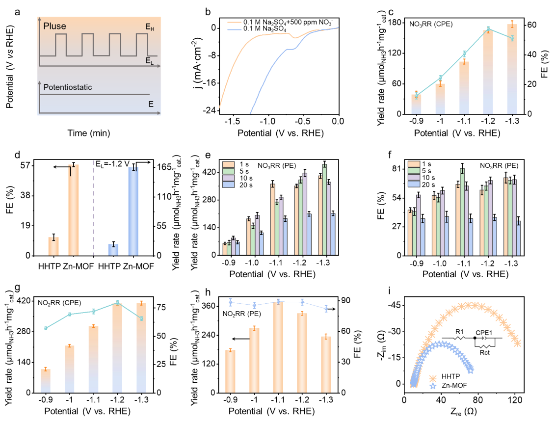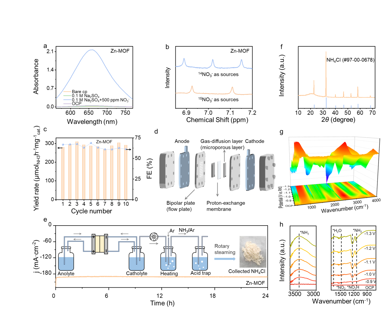 在本文中,作者采用溶剂热法合成了具有精确原子结构的导电棒状锌基金属有机框架(Zn-MOF)电极,并通过脉冲电解策略以调控NO₃RR过程中Zn-MOF电极附近NO₂⁻中间体的逐步积累与转化。结果表明,与恒电位电解相比,该策略使氨产率和法拉第效率(FENH₃)均提升一倍。此外,在流动电解池测试中,Zn-MOF催化剂在-1.1 V(vs RHE)下保持超过180mA·cm⁻²的还原电流密度。在连续循环测试和长时间稳定性测试中,NO₃RR性能均无明显衰减。长时间稳定性测试后,从电解液中成功提取出了固态氯化铵产品,该实验结果为将废水中的硝酸根转化为高价值氨衍生产品提供了一条可行途径。此外,利用原位红外光谱技术,监测了电化学NO₃RR过程中Zn-MOF催化剂表面形成的关键含氮中间体。本研究为后续设计具有精确原子结构的导电金属有机框架(MOFs),以及通过脉冲电还原技术调控关键电催化反应步骤提供了重要的实验参考。