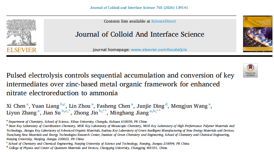 近日,理学院江明航副教授课题组及合作者在国际TOP学术期刊《Journal of Colloid and Interface Science》(中科院一区,IF=9.7)发表题为“Pulsed electrolysis controls sequential accumulation and conversion of key intermediates over zinc-based metal organic framework for enhanced nitrate electroreduction to ammonia”的研究论文。江明航副教授为该论文通讯作者,南京大学金钟教授和南京理工大学苏剑教授为本文共同通讯作者,西华大学2023级硕士研究生陈羲为第一作者。西华大学为第一通讯单位。