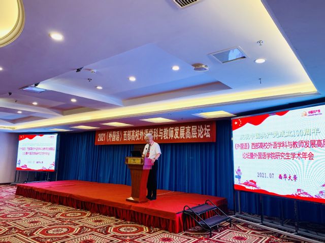 7月3日,正值中国共产党成立100周年之际,为推动中华优秀传统文化创造性转化、创新性发展,促进中外学术交流,我校外国语学院与上海外国语大学《外国语》编辑部在成都丽天花园大酒店联合举办以“外语教育与文明互鉴”为主题的“西部高校外语学科与教师发展高层论坛”。出席本次论坛的有来自复旦大学、上海交通大学、四川大学、西南大学、湖南大学、上海外国语大学、对外经贸大学、西华大学等十余所高校的专家教授、优秀博士生、硕士生代表。本次论坛采取线上和线下结合的形式,在腾讯会议与bilibili进行实况直播。