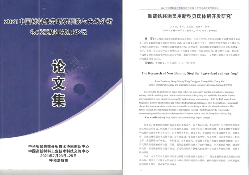 王正云在大会上汇报了课题组在钢铁耐磨材料研究过程中所发现突破传统的组织特征、力学性能及相关中试开发产品应用等工作。以王正云为第一作者被录用的论文“重载铁路辙叉用新型贝氏体钢开发研究”同时也发表在论坛论文集上。