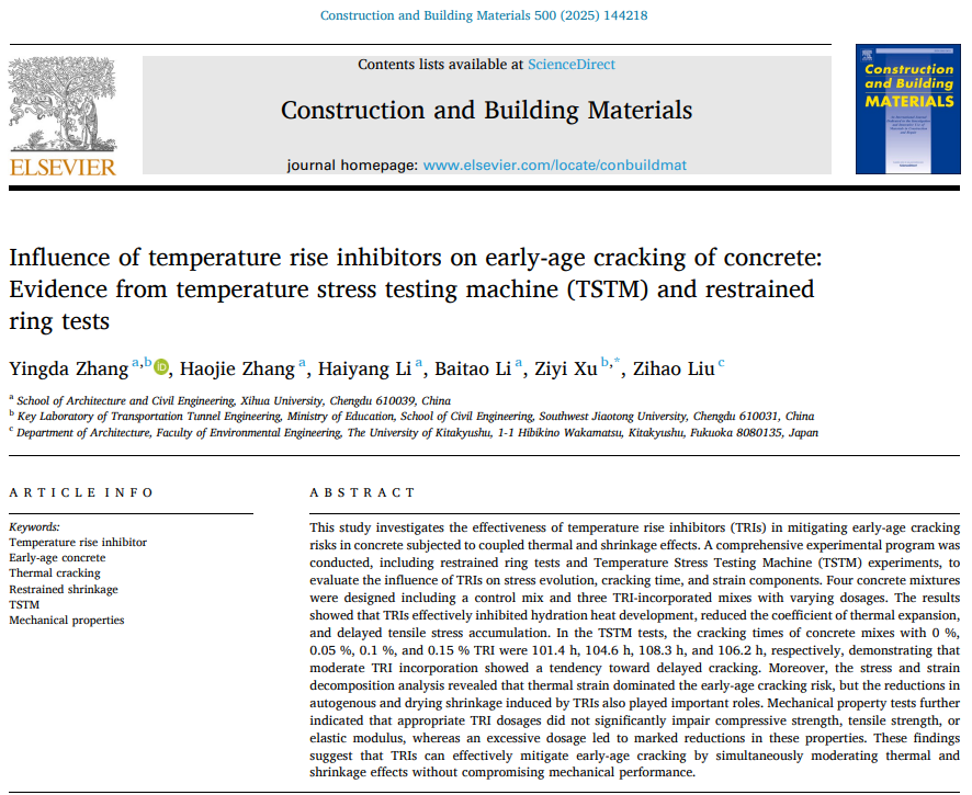 近日,建筑与土木工程学院张英达副教授团队在国际知名TOP期刊《Construction and Building Materials》(中科院一区TOP,IF: 8.0)发表题为“Influence of temperature rise inhibitors on early-age cracking of concrete: Evidence from temperature stress testing machine (TSTM) and restrained ring tests”的研究论文。西华大学建筑与土木工程学院张英达副教授为论文的第一作者,2024级硕士研究生张浩杰为论文的第二作者,西南交通大学许子宜博士为论文的通讯作者。