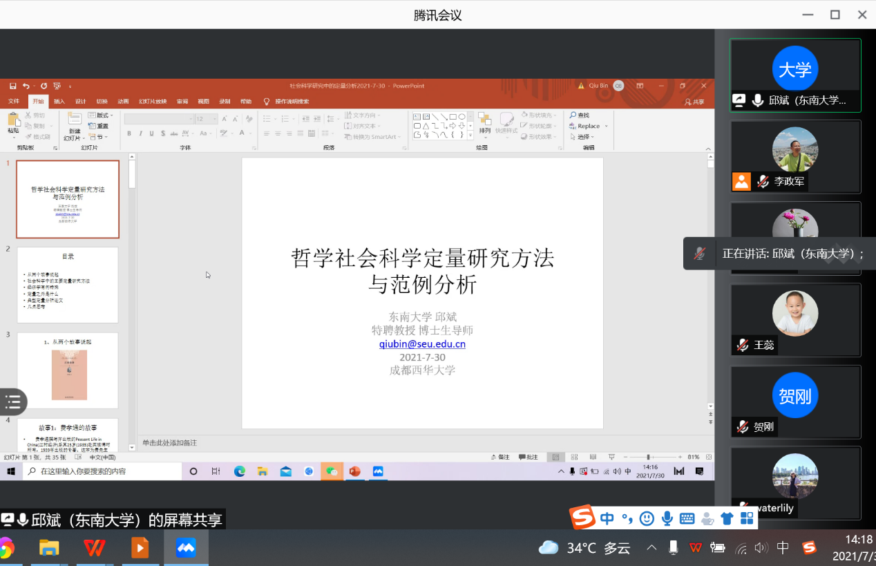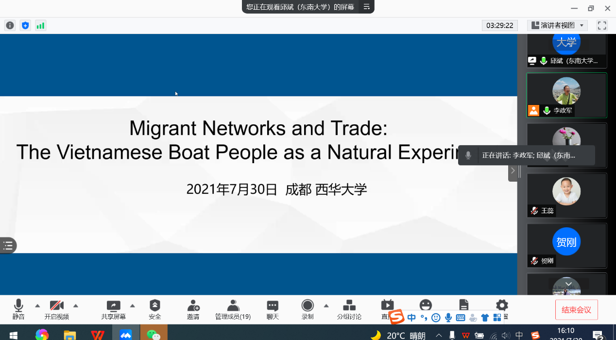7月30日,东南大学国际经济研究所所长、博士生导师邱斌教授通过网络会议的方式,为我校西方经济学教学团队暑期研修班作学术报告。参加报告会的老师有团队骨干成员,来自深圳大学、四川外国语大学、滁州职业技术学院等高校的老师们。学术报告会由团队首席教授李政军主持。
