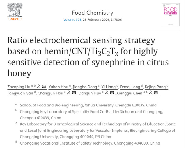 近日,食品与生物工程学院食品营养与安全团队在《Food Chemistry》(中科院一区TOP,IF: 9.8)发表题为“Ratio electrochemical sensing strategy based on hemin/CNT/Ti3C2Txfor highly sensitive detection of synephrine in citrus honey”的研究性论文。食品与生物工程学院刘振平教授为第一作者,通讯作者为重庆大学侯长军教授、霍丹群教授和西华大学食品与生物工程学院陈祥贵教授。