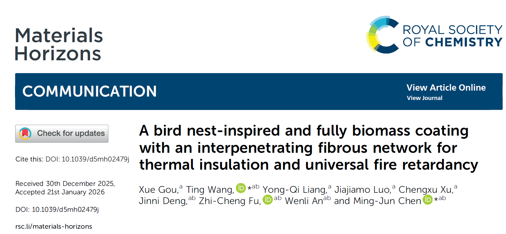 针对传统保温材料在阻燃改性恶化力学性能和保温性能的矛盾问题,且传统阻燃涂层与基材粘结力弱,易导致涂层剥离丧失阻燃性的难题,课题组受鸟类筑巢行为的启发,通过绿色多基团协同策略构建了一种不含传统阻燃元素的全生物质基防火涂料,实现了"一石多鸟"的效果。其中,没食子酸通过π-π堆积超分子纤维聚集体,模拟结构“细枝”;壳聚糖则通过复制“唾液”的粘合功能增强内聚力,两者组装形成具有纳米孔洞的互穿网络微结构。涂覆到聚氨酯硬泡上,其能赋予材料优异的隔热性能(24.85 mW·m-1k-1)和力学性能(压缩模量9.37 MPa)。得益于丰富的界面粘附基团和增强的内聚力,该涂层对多种基材均表现出强附着力。此外,脱羧/碳化过程与酚羟基自由基捕捉能力的协同作用,使材料具有膨胀阻燃行为和广谱阻燃特性。这项工作为开发具有巨大应用潜力的多功能阻燃涂料建立了一种简便环保的设计策略。