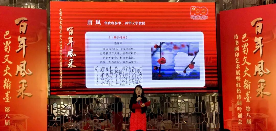 6月18日,由四川省人民政府参事室、四川省人民政府文史研究馆主办的“百年风采——巴蜀文史翰墨第八届诗书画印艺术展暨红色诗词吟诵活动”在多宝寺壹号艺术中心·四川福宝美术馆开幕。我校唐岚教授作为四川省政府参事参加了活动,并在红色诗词分享中,吟诵了毛主席的《卜算子·咏梅》。