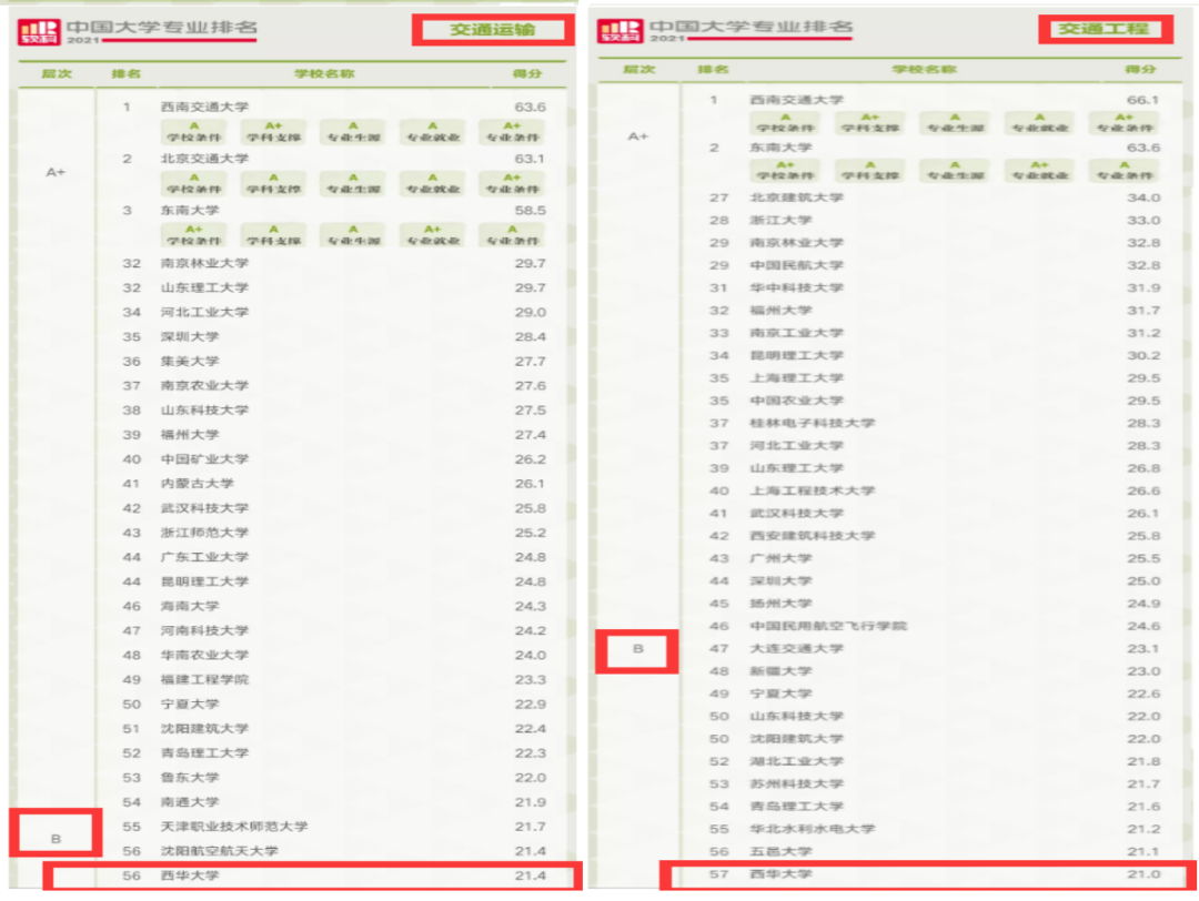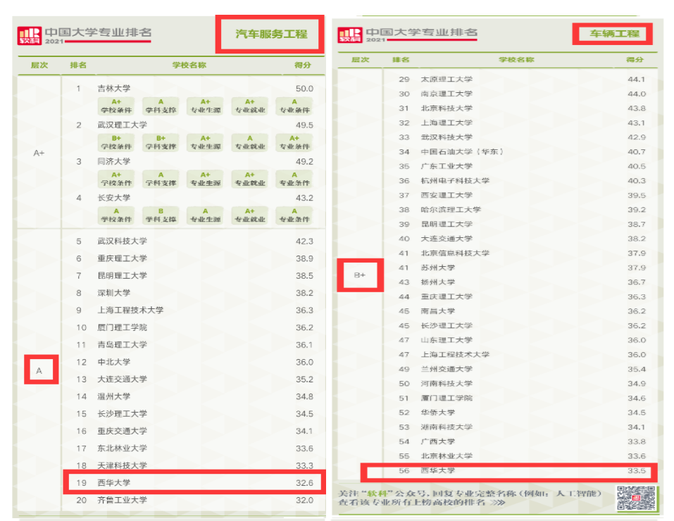 6月22日,高等教育评价专业机构软科正式发布2021“软科中国大学专业排名”。排名包括509个本科专业,每个专业榜单发布的是所有开设该专业的高校中排名位列前50%的高校,共有925所高校的28550个专业上榜。我校汽车服务工程专业获评A,排名第19名;车辆工程专业获评B+,排名第56名;交通运输专业获评B,排名第56名;交通工程专业获评B,排名第57名。