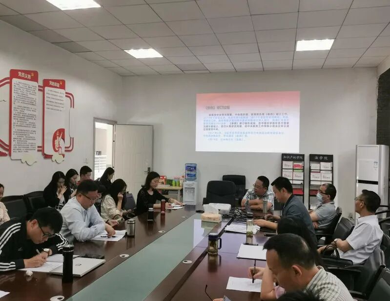 5月27日,识产权学院、法学院召开党委中心组(扩大)会议,传达校党委理论学习中心组(扩大)学习会的重要指示精神,集中学习《中国共产党普通高等学校基层组织工作条例》,并从《条例》修订的背景、经过、意义、遵循原则和主要内容等方面进行了细致的解读。