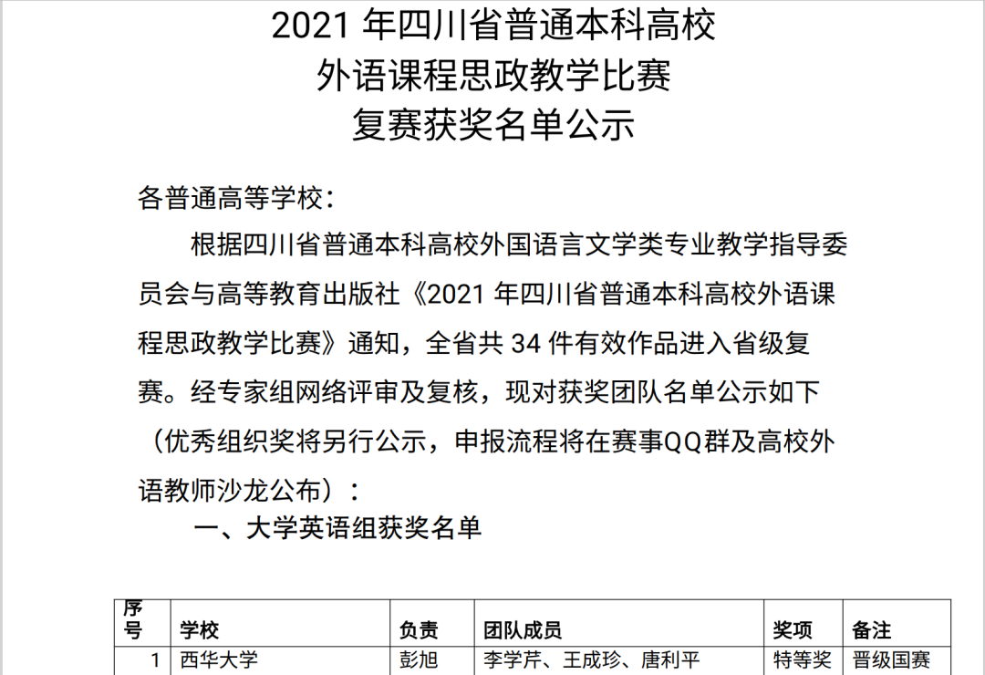 近日,四川省普通本科高校外语课程思政教学比赛落下帷幕,我校教师彭旭、李学芹、王成珍、唐利平组成的团队以第一名的成绩荣获本项赛事四川省区特等奖,并晋级国赛。