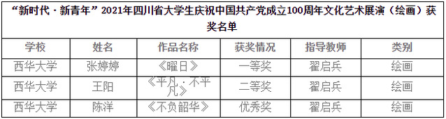 近日,“新时代·新青年”2021年四川省大学生庆祝中国共产党成立100周年文化艺术展演专家评审结果出炉。我校美术与设计学院美术系2018级美术学专业学生张婷婷、2017级美术学专业学生王阳、2018级美术学专业学生陈洋报送的三幅绘画作品分别荣获一等奖、二等奖、优秀奖,美术学专业教师翟启兵被评为“优秀指导教师”。