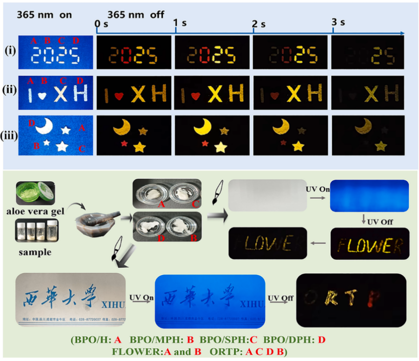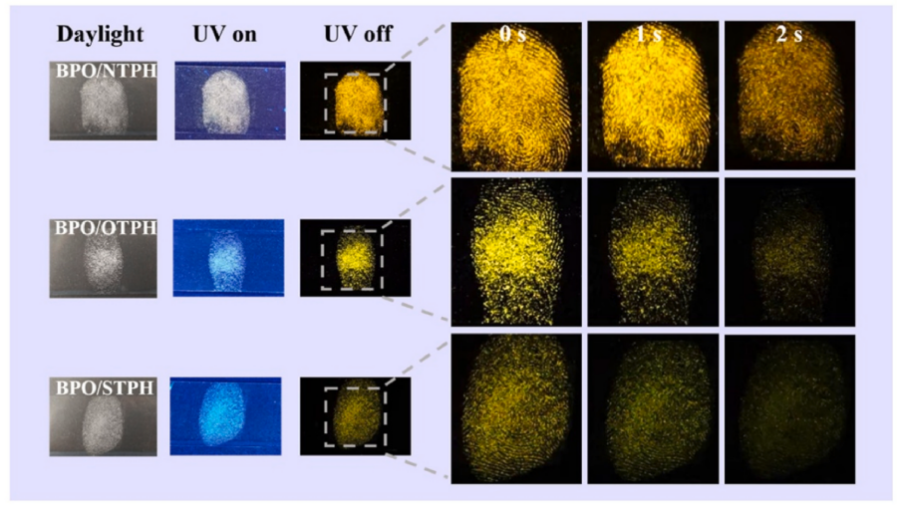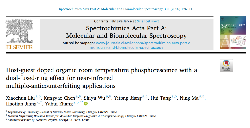 此外,张亚会副教授团队还在《Spectrochimica Acta Part A: Molecular and Biomolecular Spectroscopy 》(中科院二区)和《Dyes and Pigments》(中科院二区)发表研究成果。通过稠环调控RTP性能,实现信息多重信息防伪技术和指纹识别技术。西华大学为第一单位,张亚会副教授为通讯作者,2024级硕士研究生周文峰为第一作者。