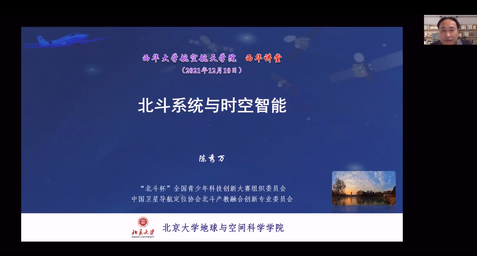 12月10日晚,航空航天学院举办的“西华讲堂”在腾讯会议举行,北京大学地球与空间科学学院教授陈秀万、地球观测与导航教育部工程研究中心“北斗杯”全国青少年科技创新大赛秘书处副秘书长丘扬老师受邀为同学们作了题为“北斗系统与时空智能”的讲座。讲座由西华大学教育部智能融合空地载具教育部工程研究中心副主任陈金良主持,学院组织400余名学生参加讲座。