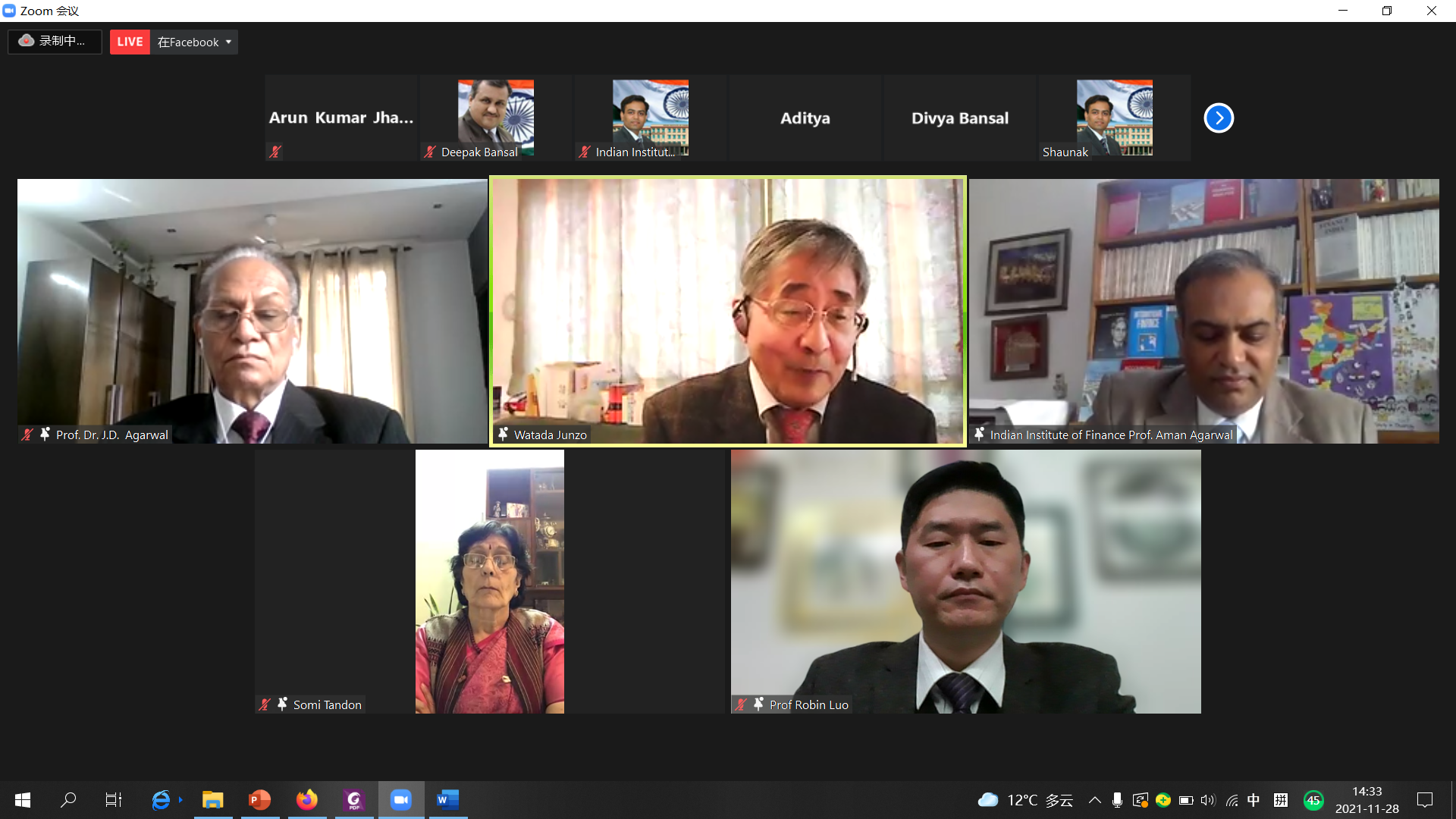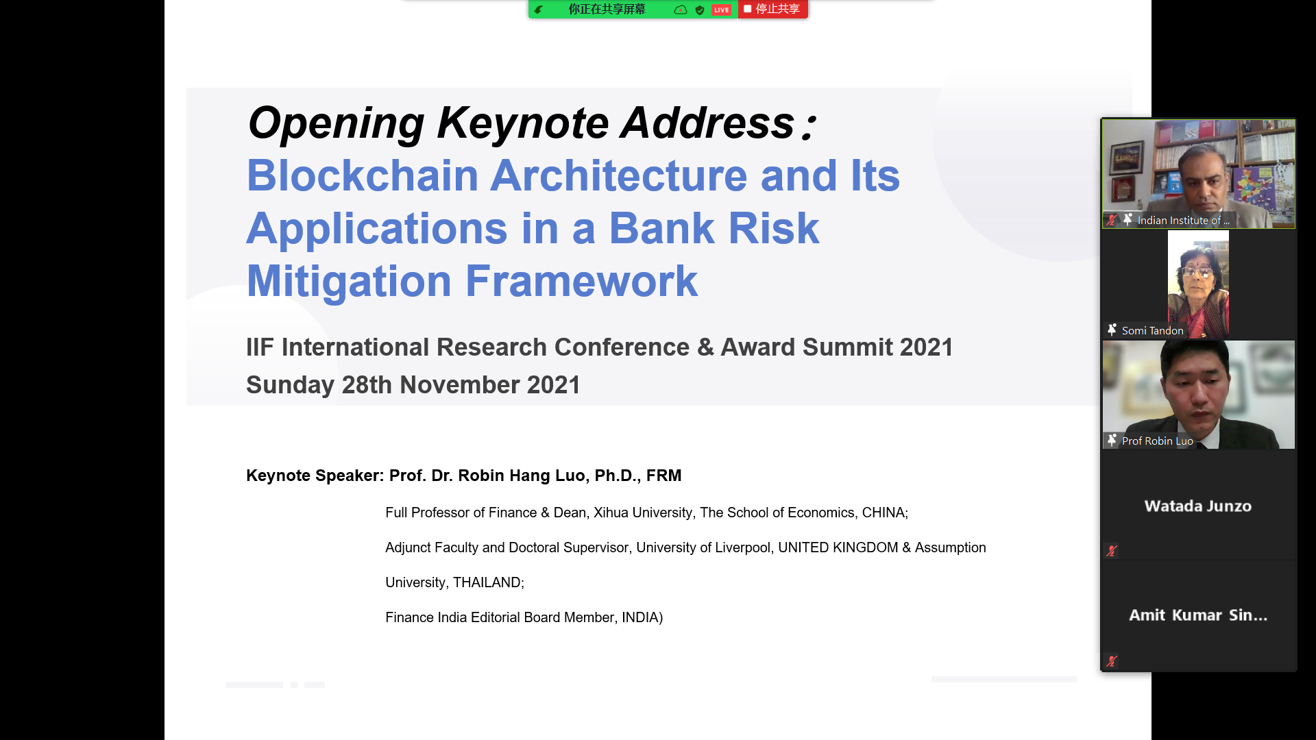 11月27-28日和12月1-2日,由印度金融研究院(Indian Institute of Finance)主办的International Research Conference & Award Summit 2021国际学术会议通过在线方式举行。会议由印度金融研究院院长J.D.Agarwal教授主持,来自46个国家、86所高校的500余名学者参加了本次学术会议,会议全程通过Facebook等主流媒体全球直播。