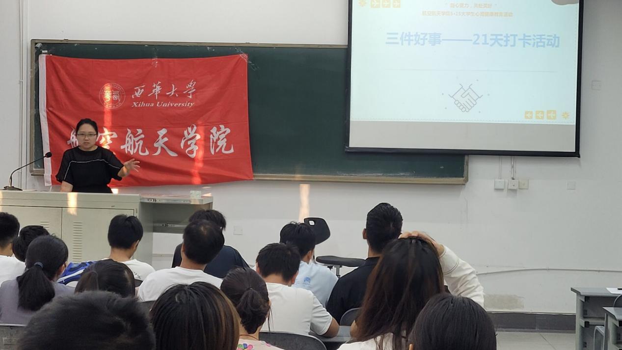 9月29日下午,航空航天学院在6C116开展“三件好事——21天打卡活动”动员会。38名志愿者和各班心理委员参加了本次会议,会议由学工办主任兼心理指导教师奉姣主持。