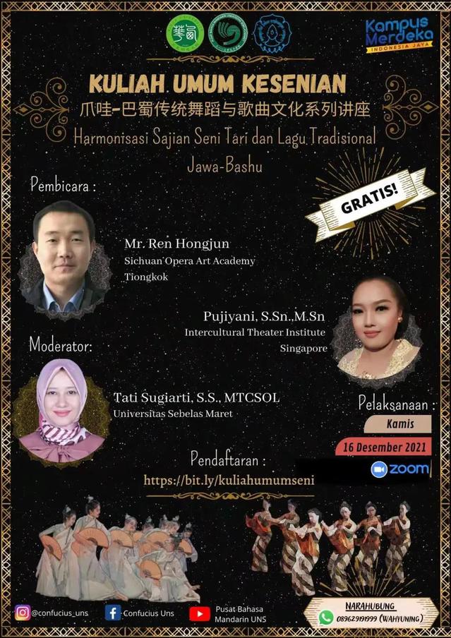 12月16日,三一一孔子学院举办了爪哇——巴蜀传统舞蹈与歌曲文化讲座。四川省艺术研究院任红军研究员、三一一大学文化交流中心普吉雅尼女士分别向与会者介绍了四川特色歌舞和爪哇歌舞。三一一大学孔子学院中方院长陆雨在会议致辞,三一一大学文化学院华尔多院长向会议致辞并宣布活动开幕。孔子学院外方院长潘范妮和孔院教师、来自三一一大学中文系和西华大学文新学院的60余名师生参加了讲座。