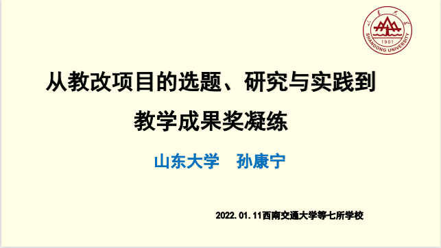 1月11日上午,为切实提高我校教师的教育教学研究水平,进一步做好我校教学成果奖的申报工作,提高教学成果奖的申报质量,由西南交通大学主办、西华大学等六所高校协办的“从教改项目的选题、研究与实践到教学成果奖凝炼”专题讲座在腾讯会议举行。本次讲座邀请到国家级教学名师、山东大学孙康宁教授主讲,我校100余名教师参加了此次讲座。