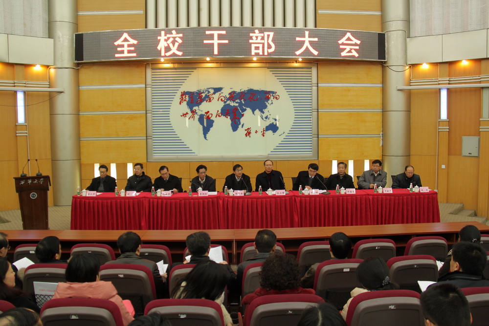 2月21日上午,学校在四教报告厅召开全校干部大会,学习传达有关会议精神,通报学校2012年终考核结果,安排部署学校2013年主要工作。全体校领导、全体中层干部参加了大会。会议由校党委书记张小南主持。 会上,校党委书记张小南传达了习近平总书记在中国共产党第十八届中央纪律检查委员会第二次全体会议上发表的重要讲话以及王岐山所作工作报告的主要内容,并传达了省委书记王东明在省纪委十届二次会上的讲话精神。他要求,全校各级干部要把思想和行动统一到中央要求上来,率先垂范,严明纪律,厉行节约,严格控制公务接待费,并以制度建设和加强监督为着力点,切实把学校反腐倡廉工作引向深入。 张书记结合上级有关部门和文件要求,联系2013年学校主要工作,对全体干部提出了三点要求:一是要带头执行中央和省委提出的各项规定,求真务实,真抓实干,切实转变工作作风,争做遵章守纪的模范,在新的学期给全校广大师生员工一个新的气象;二是要坚持锐意进取,克服“软、懒、散”现象,迎难而上,既要关心教职工,维护师生切身利益,又要大胆管理,严格要求,对于不利于学校发展的,要坚决反对,及时制止;三是反腐倡廉要警钟长鸣,要从制度源头上抓起,规范管理,让权力在阳光下运行,干部要坚持一岗双责,要严格要求班子,严格要求自己,做廉洁从政的典范。 孙卫国校长传达了1月22日四川省副省长黄彦蓉、省教育厅涂文涛厅长(时任)分别在四川省教育工作会议上的讲话精神。之后,孙校长代表学校就2013年学校党政主要工作作了具体部署。2013年,学校将深入学习贯彻落实党的十八大精神,解放思想,实事求是,真抓实干,开拓创新,坚持以科学发展观为指导,坚持特色发展、开放发展和人才强校战略,坚持走内涵发展之路;坚持以提高人才培养质量为主线,分解落实学校发展目标,全面抓质量、优先抓教学、重点抓学科、突出抓科研、关键抓人才,扩大民主,改善民生,强化规范管理,推进学校科学发展。 校党委副书记王小林传达了2月5日省委教育工委、省教育厅召开的全省高校加强作风建设工作会议精神,通报了学校2012年终考核结果,包括学院六项指标综合考核、单项考核、机关单位业务部门考核、非学科型学院考核、中层领导班子考核、中层领导干部个人考核、校级领导班子和校级领导干部考核结果。 计划财务处处长谢合明就2013年学校公务接待费预算指标的调整情况作了说明。党办、校办、生物工程学院、体育学院等单位负责人现场与学校签订了安全责任书和廉政责任书。其他单位也将相继与学校签订安全责任书和廉政责任书。