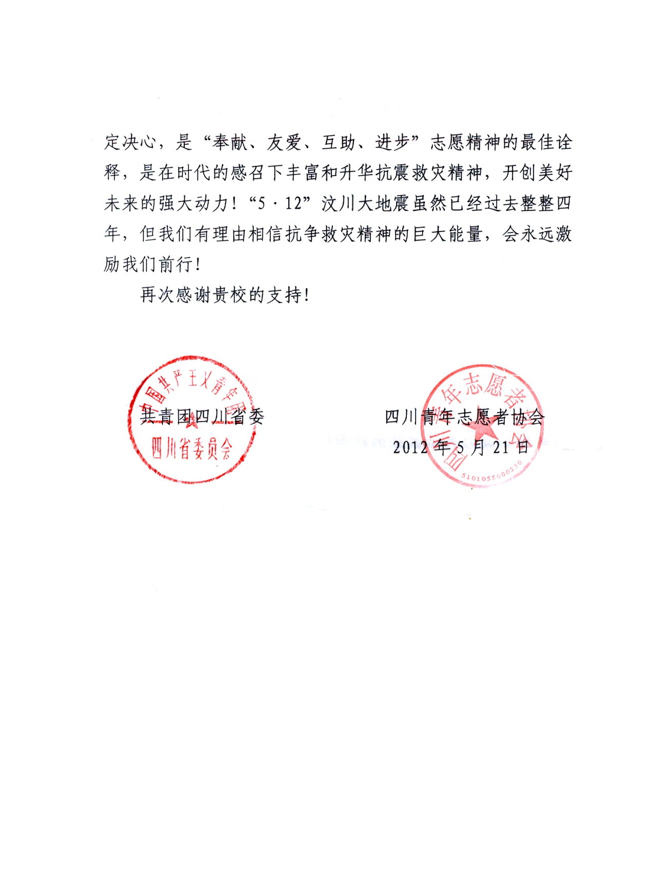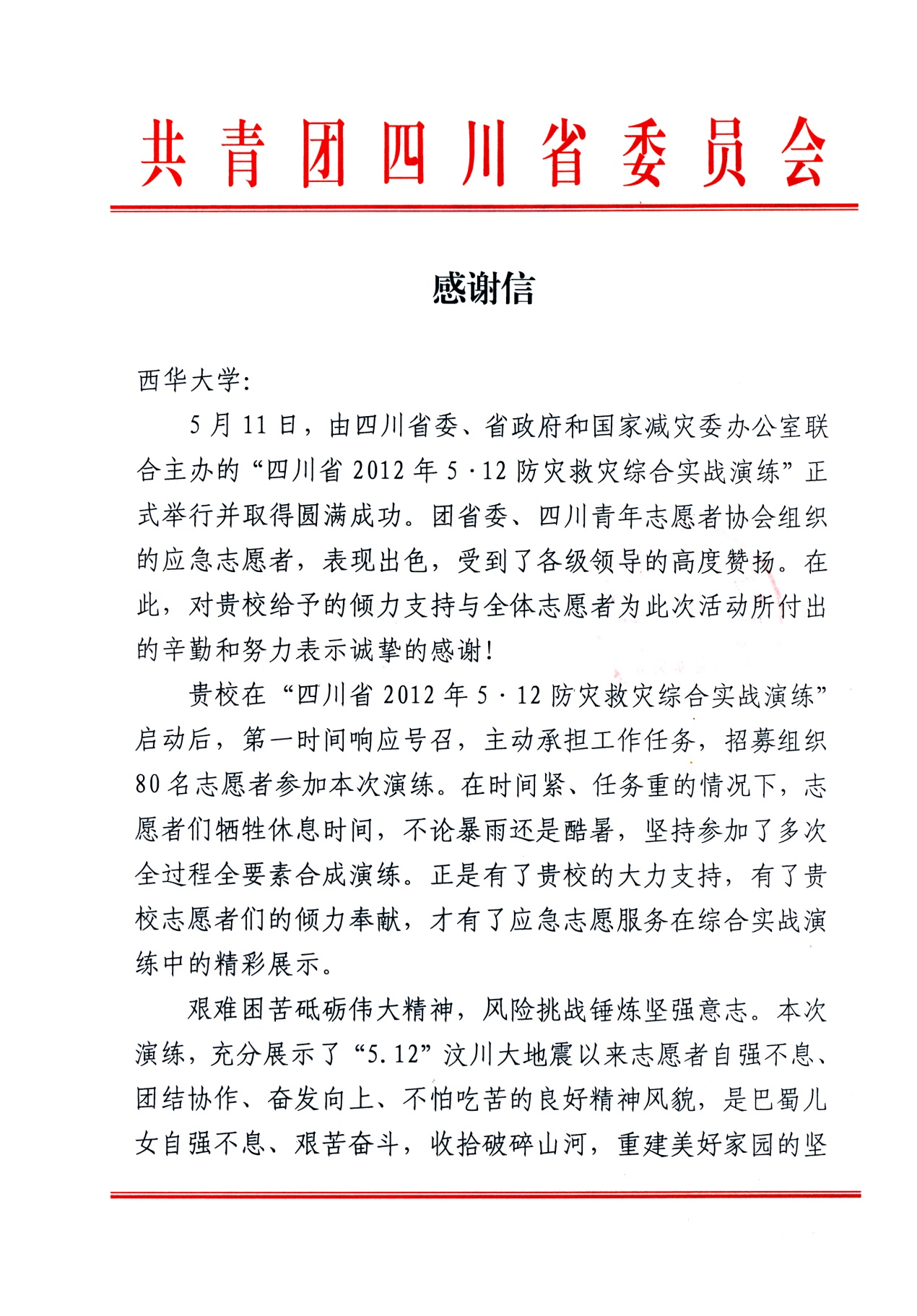 近日,共青团四川省委向我校发来感谢信,感谢我校对“四川省2012年5.12防灾救灾综合实战演练”的大力支持及我校全体志愿者的辛勤付出。