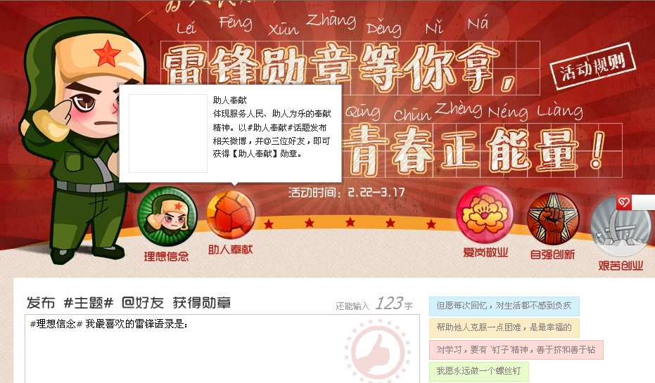 1963年3月5日,毛主席亲笔题词“向雷锋同志学习”,到如今已整整50年。“雷锋”这两个字作为一个特有的名词,曾是一代人成长的路标,“学习雷锋好榜样”的歌曲也成为一代人的集体回忆。 “雷锋精神”这么久远,如今已经过时了?NO NO NO,西华易班说:“过时的是你!” 又是一年的3月,草长莺飞,阳光正好。在西华,一场通过易班平台掀起的“‘易’起学雷锋”的活动正在热闹开展。 雷锋精神50年 微博开启正能量 “如果,爱与被爱可以让人快乐;如果,快乐可以传递更多的人;如果,更多的人能让世界变得美好;我愿做一名志愿者,我愿与所有真正有爱心的人共同成长。践行雷锋精神,从点滴做起,志愿服务不需要多么伟大,需要的是常态化!”——这是一位同学通过易班平台在新浪微博 #雷锋50年# 话题中的留言。 为了纪念毛泽东同志“向雷锋同志学习”题词50周年,易班和中国大学生在线连同新浪微博,举办了“弘扬雷锋精神” 微博行动。赶快登陆易班或是新浪微博吧,将你心目中的雷锋与大家分享,将身边的好人好事跟大家分享。 雷锋勋章等你拿 传递青春正能量 登陆西华易班,讲述身边的雷锋故事,不仅可以传递青春正能量,还可以领取雷锋勋章哦! “雷锋精神”系列勋章分为“理想信念、助人奉献、爱岗敬业、艰苦创业、自强创新”五枚,每一枚又分铜质、银质、金质勋章三个等级。在指定的时间段发布某一主题的微博并@3位好友,即可获得铜质勋章;累计5天发布,可领银质勋章;累计10天发布可领金质勋章。 “助人为乐、爱岗敬业、勤俭节约、见义勇为、自强创新”,让我们一起点亮雷锋勋章,用微博传递青春正能量。还等什么呢?赶快行动吧! 学习雷锋好榜样 助人为乐为己任 生活中,让我们心头一暖的事儿时刻都在发生。或许一件好事算不上什么,但许多件好事汇聚起来,一定能让生活变得更加美好。来易班吧,写下自己做过的好事儿,或是身边看到、听到的好事儿。看看大家的青春正能量有多大的威力吧! 学习雷锋,从身边做起,从点滴做起。西华学子们不仅通过易班平台,也通过各种丰富的活动传递雷锋精神。 “爱心义卖,助残帮学”活动,由志愿者联合会与艺术学院同学合作,利用自己专业特长进行慈善活动,体现了志愿服务的专业化;无偿献血活动,通过开展无偿献血(血小板)活动,宣传无偿献血的知识,并倡导同学关爱社会;“学习雷锋,社区同行”活动,为社区居民服务,在社区传递雷锋精神正能量。此外,还有交通文明劝导活动、校园文明DV拍摄、雷锋邮递员等等……师生扎实行动,从自身做起,从小事做起,积极投身到学雷锋的潮流之中,通过各种形式,大力弘扬、学习雷锋精神,争做文明有礼的西华人。 “易”起学雷锋 活动链接:http://www.yiban.cn/topic.php?I=20130228