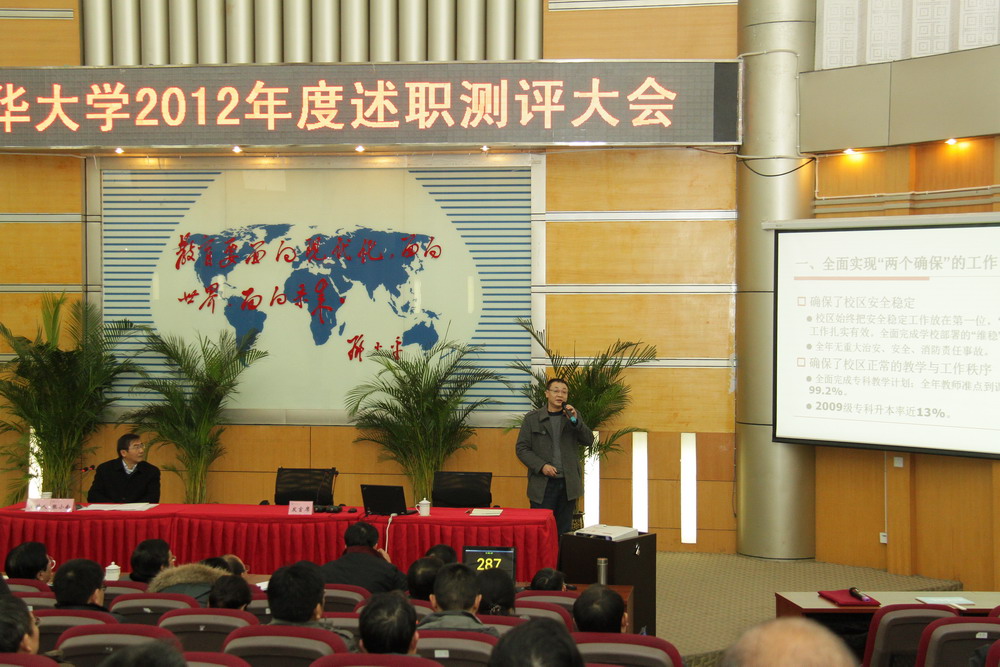 12月28日,我校2012年度述职测评大会在四教报告厅举行。全体校领导、校级干部,副处及以上中层领导干部,近三届离退休的正校级老领导,四川省及成都市党代表、人大代表、政协委员,省政府参事,各民主党派主委,教师代表和各分工会、教代会主席参加了会议。