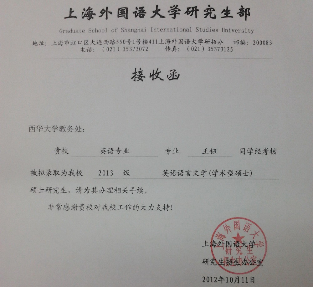 近日,我校外国语学院2009级商务英语专业的王钮同学以优异成绩顺利通过上海外国语大学研究生推免复试,拿到了上外的接收函,将于2013年9月正式成为上海外国语大学的一名硕士研究生。 上海外国语大学是国内外语类顶尖学府,王钮同学能在上外深造,是一次难得的机遇和挑战,这必将激励在校的学弟学妹们更加完善自我,向着自己的理想而努力奋进。