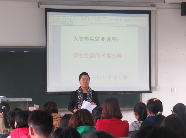 10月21日下午2点,人文学院在6C-513教室举办了题为“职业生涯的幸福密码”的就业讲座。主讲人为苹果树下教育培训学校校长伍苹,学院2010级汉语言文学专业的同学参加了本次讲座。