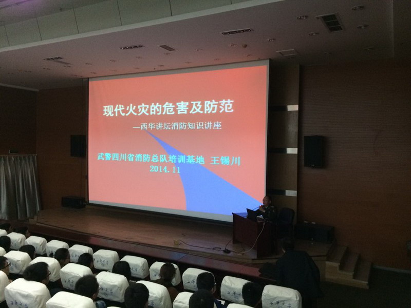 11月6日14:00,西华大学“现代火灾的预防与控制”大型消防安全讲座于新图书馆报告厅举行。参与此次讲座的有学校各级领导、各学院老师和学生代表、以及校内安保人员。