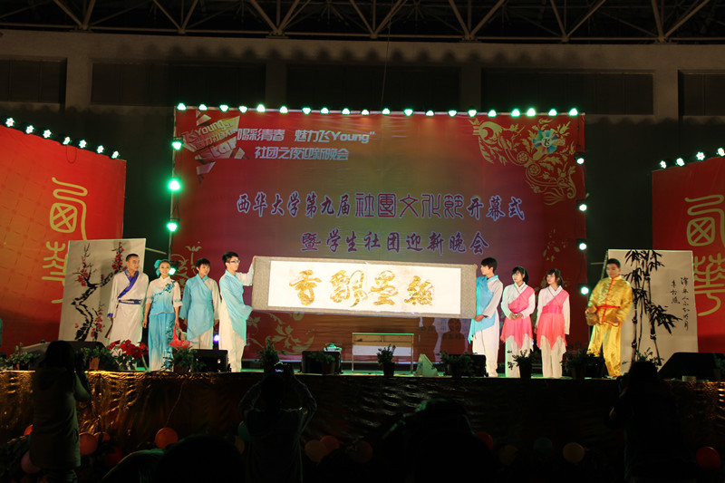 11月24日晚19:00,我校体育馆内流光溢彩、人声鼎沸,由校团委、社团管理委员会、全体学生社团、校学生会、校艺术团承办,中国电信四川公司,朋友超市购物中心协办的第九届社团文化节开幕式晚会隆重举行。校团委全体老师,中国电信成都分公司校园中心总经理舒康先生,副总经理米黎先生等代表以及23所院校社团工作代表出席了此次活动。本次晚会作为“喝彩青春,魅力飞young”四川省社团文化节的一个重要组成部分,不仅得到了团省委领导的关注,更得到了中国电信四川公司的全程赞助。 晚会开始前,首先进行的是西华大学社团近年来所取得成果的PPT放映,该宣传片充分展示了学生社团的文化风采以及辉煌成绩。随后,电声乐队《光辉岁月》融合光电与豪迈奔放的歌声,让观众眼前一亮,伴随着灯光秀和现场表演,晚会开始进入倒计时,主持人闪亮登场,宣布“西华大学第九届社团文化节开幕式暨学生社团迎新晚会”正式开始。 首先,校团委书记蒋志勇致辞,他充分肯定了近年来我校学生社团工作的成绩,明确了学生社团对于建设校园文化以及丰富学生第二课堂的重要性,提出了推动校风学风建设向更深层次发展的殷切期望。最后,他预祝西华大学第九届社团文化节开幕式暨学生社团迎新晚会取得成功! 19点整,节目正式开演,来自不同类别的社团为大家展示舞蹈、歌曲、武术、器乐、魔术等丰富多彩的节目,整个晚会亮点突出,现场气氛高涨。继续跳舞协会街舞《keep on dancing》充满活力与激情,展现了学生社团的青春魅力;《江南style》更是展示出了西华全体社团人的style;书法协会展示《翰墨飘香》融功夫茶、古典音乐、舞蹈、书画于一体,古韵绕梁,舞姿流连,很好地表现了中国古典文化魅力;动漫协会Cosplay秀《樱之幻想》,围绕“小樱的故事”将动漫中可爱、炫酷、妩媚、冷酷的角色搬上了舞台,人物活灵活现,节目特色鲜明,展示了另一个奇幻世界。 创新是各协会表演的重要元素,也是本次晚会的灵魂。在传统的演唱舞蹈等表演之外,机器人协会、航模协会、科技协会、大学生汽车协会、电气协会联合推出的科技展示,西华好声音前12强歌曲《我的舞台》,魔术协会魔术表演《玉石俱焚》,军事爱好者协会军体拳表演《青春士兵》,校艺术团器乐表演《献给爱》,经贸学院啦啦操表演,跆拳道协会跆拳道表演《跆武极限》等独特的新风格也让在场观众耳目一新。整场晚会,台下欢呼声、尖叫声、喝彩声不绝于耳。 微博大屏的运用是本次晚会的又一大亮点,在五千多条微博互动中,大家表达了对晚会节目的各种赞叹与祝福。晚会中穿插的微博抽奖环节更是让现场的幸运观众在享受节目乐趣的同时获得了别样的惊喜。 本场晚会历时近三个小时,凝聚了西华大学社团人的心血,深刻地诠释了学生社团文化节“喝彩青春,魅力飞young ”的主题。西华大学第九届社团文化节开幕式暨学生社团迎新晚会的成功举行也标志着第九届学生社团文化节活动的正式开始。 据悉,当天下午3点,“2012年成都市高校学生社团建设与发展工作研讨会”在临江苑学术交流中心会议室举行,来自川内的23所院校的社团工作代表齐聚西华大学,就创新社团工作、社团组织建设、社团管理方法等方面进行了深入的交流,增进了成都各高校社团工作的联系。