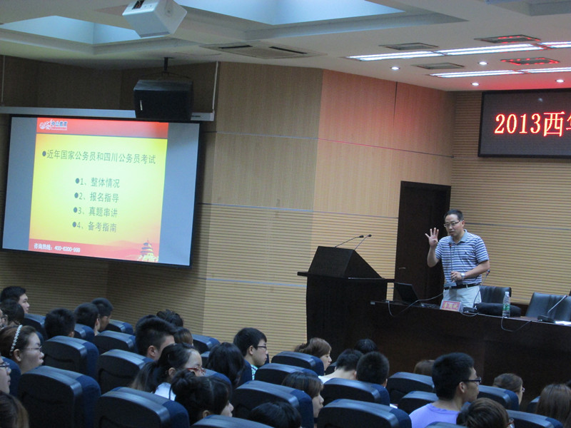 6月4日,2013年西华大学“中公教育”助学金颁发仪式在行政楼一楼报告厅举行。仪式结束后,李国斌先生作了公务员考试解析讲座,分别从整体情况、报名指导、真题讲解、题型串讲四个方面给同学们做了分析。