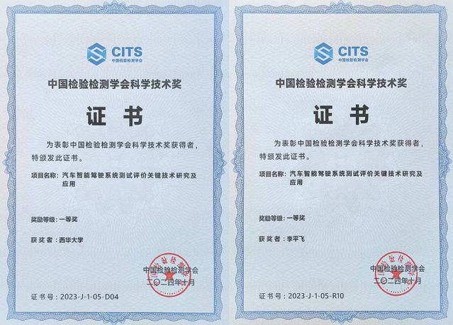 近日,由中国汽车工程研究院股份有限公司牵头,中国标准化研究院、重庆长安汽车股份有限公司、西华大学、重庆大学协作共同完成的成果“汽车智能驾驶系统测试评价关键技术研究及应用”荣获中国检验检测学会科学技术奖一等奖。我校汽车与交通学院交通安全科研团队参与了该项目的研究,其成员李平飞副教授作为成果主要完成人也获得了一等奖。