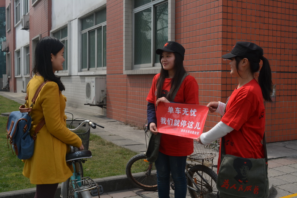一顶嵌着红五星的军帽,一枚分外扎眼的“雷锋”胸章,一个“为人民服务”墨绿色的斜跨帆布书包,一件火红火红的T恤,一双磨损的运动鞋,西华大学“雷锋侠”分外引人注目,他们的身影活跃在校园内外。 3月5日,我校志愿者联合会举行了“雷锋侠”志愿者活动,20名穿着打扮靓丽的“雷锋侠”横空出世,穿梭在校园内外,为学校师生献爱心,帮助同学们找回那失散多年的信件、证件,为同学们摆放好自行车,为同学们讲讲雷锋的故事,为同学发放雷锋日记卡片,在学校西大门对不遵守交通规则的同学进行文明劝导。 “雷锋侠”处处传递雷锋勤俭节约的精神。在食堂就餐后的餐具回收点前,志愿者向每一个做到了“光盘”的同学,送上一张“好人卡”,赞美的同时,希望更多人能够将“好人卡”传递出去。虽然早就对食堂每天好几桶的饭菜浪费看不下去,但真正要走上前去劝导大家厉行节俭,依然不是一件容易的事情。于是,“雷锋侠”们想了一个好办法,随机在食堂里发送雷锋日记卡,提醒大家注意节约。 他们都是西华大学的普通学生。有刚成为志愿者不久的大一同学,有已经颇有志愿服务经验的志愿组织骨干;有主动报名,过五关斩六将的积极分子;也有带着点“顾虑”,不太能放下“面子”,怕被人看“笑话”的网络招募者。 他们要制作雷锋卡片,要细细翻阅雷锋的每一张照片,找出他们觉得最帅的;要知道雷锋的故事,既要知道雷锋的好人好事,更要知道雷锋为什么要“照相写日记”的事;要认真阅读雷锋日记,找出最让他们感动的话语。然后,制作成一张张精美的,传递正能量的,但又不失青春和俏皮的卡片,在同学们中间传递。 他们要继续做好人好事。利用休息和周末的时间,要在校园认真走访和规划,安排好最佳的自行车规范停放的点位,让骑车的同学方便、放心,同时还能保持校园环境的整齐。如果有同学赶时间,他们会贴心地替你停放好自行车。如果自行车停放不规范,他们会不厌其烦地一遍又一遍地摆放整齐。最后还会送你一张雷锋日记卡,“亲,满意请给5分哦”。 “雷锋侠”更重要的使命是肩负着让那众多被遗忘的信件、证件找到失散多年的主人。在收发室、在保卫处的执勤点、在教学楼物管,总有那么一堆失散的“孩子”。他们把这些物品全部收集到一起,登记造册,然后分门别类地进行整理。凡是能够通过各种渠道联系到失主的,统统装在帆布包里,像快递一样准确送到失主手中。别忙,再送上一张“好人卡”,鼓励失主也为他人做好事,把雷锋精神传递出去。凡是不能联系到失主的,将统一在校内摆点,凭本人的有效证件领取。 他们想做的还有很多。让学校的草坪和操场随时保持干净,让校园的交通规范有序……让更多人都能成为“西华雷锋侠”的一员,把雷锋精神传递出去,希望在不久的将来,校园处处都是,社会处处都有西华雷锋侠的身影。