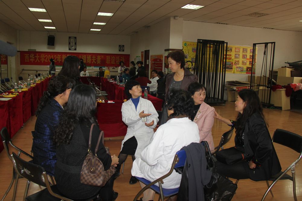 10月19日上午,学校举行2012年教职工“银婚夫妻”联谊活动。西华大学34对银婚夫妻,沐浴在秋日的阳光里,回望彼此牵手走过的美好时光。 校工会常务副主席王代言代表学校为34对“银婚”夫妻献上诚挚祝福。他说:“银婚是一敦绵长的普洱,经九千一百二十五个日夜的发酵,是相濡以沫地拥有,才能品味生命的醇香。”银婚夫妻代表、党委宣传部王蜀苏老师深情地讲述了25年与丈夫相濡以沫的幸福生活。她说:“走在一起,是缘分;一起在走,是幸福。”并祝在座所有的银婚夫妇们家庭美满幸福。 此次银婚活动,校工会特别邀请了成都市第三人民医院的专家们共同联谊。在联谊活动中,专家们给银婚夫妇们讲解了肿瘤防治,高血压、糖尿病人的保健知识。随后,银婚夫妇们还就常见的颈椎病的防治等方面进行了咨询。 联谊活动现场 老师们咨询身体保健知识