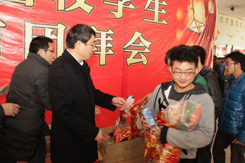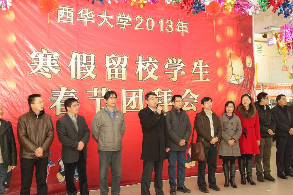 2月6日(农历腊月二十六)上午,学生第一食堂张灯结彩,喜气洋洋,学校2013年寒假留校学生春节团拜会在此隆重举行。学校为每一位寒假留校学生准备了礼品、红包和团年饭,把浓浓的年味儿带到了留校同学的身边,让他们感受到了学校的关爱和温暖,在学校过上了一个热热闹闹的新年。 上午10时,寒假留校学生春节团拜会在学生一食堂温馨祥和的气氛中拉开帷幕。校党委副书记王小林带领党委办公室、宣传部、学生工作部、校长办公室、计划财务处、校团委等相关职能部门负责人以及各学院分管学生工作的书记(副书记)一同慰问了寒假留校学生,观看了同学们自编自导自演的文娱节目。春节团拜会由学生工作部部长徐元彬主持。 王小林副书记致新年贺词。他说,农历新年是中国人最重要的传统节日,而学校每年总有一部分同学,要么在校安心准备考研,要么利用假期为自己“充电”,要么参加勤工助学,因各种原因远离家乡,远离父母,不能回家团聚,但西华大学就是同学们的家,学校将尽力为同学们在学习生活等方面提供条件,让大家在学校也能度过一个愉快的新年。王小林副书记代表学校党政向全体寒假留校学生以及节假日期间仍坚守岗位的教职员工致以亲切的问候,祝福师生蛇年吉祥,祝愿大家度过一个平安、欢乐、祥和而有意义的春节。他希望同学们做好假期安排,注意出行安全;希望同学们积极响应中央号召,厉行节约,反对浪费;希望同学们节日期间主动给家人打个电话,报声平安,转达学校对他们的节日祝福。 团拜会上,每名留校学生还领到了学校为他们准备的“压岁钱”和大礼包。面对学校的关心,面对学校领导和老师们的亲切问候,留校学子备感温馨,他们表示将以优异的成绩回报母校。 为了让留校学生过好寒假和春节,学生工作部根据学校部署,精心制定工作方案,组织安排各项活动。除了举行春节团拜会和发放慰问金、慰问品外,还在2月10日(正月初一)为留校学生免费提供早餐。 机械工程与自动化学院2010级学生雷翠翠就是寒假留校学生之一。在团拜会上,她作为代表发言,感谢学校在寒假期间给予的关心和帮助,并表示将用实际行动去实践自己的诺言,努力学习,不断完善自我。她表示,这个春节虽然没有回家团年,但深深感受到了学校带来的家一般的温暖。 爆竹迎新年,师生共贺岁。中午12时,王小林副书记及相关职能部门负责人、各学院书记(副书记)与寒假留校学生共同吃了团年饭,师生促膝交谈、问寒问暖,共话学校发展,同庆新春佳节。 四川电视台科教频道、四川新闻网等媒体记者来校作了采访报道。