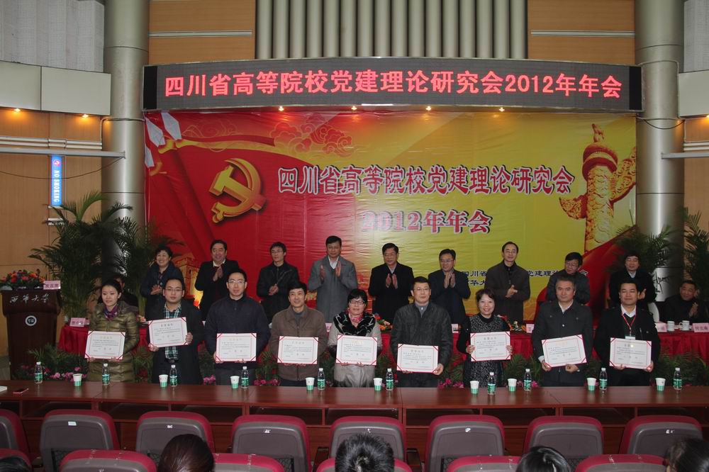 会议还对2012年四川省高校党建优秀论文进行了表彰。四川省高校党建理论研究会副会长兼秘书长、四川大学党委常务副书记罗中枢宣读了《四川省社科联关于表彰2011-2012年度十佳社科学会、先进社科学会和学会先进工作者的决定》和《四川省高等院校党建理论研究会关于优秀论文评奖结果的通知》。主席台就座的领导为获奖单位及个人颁发了证书。