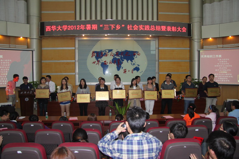 9月28日,2012年暑期“三下乡”社会实践总结暨表彰大会在四教报告厅隆重举行。校党委副书记王小林,党委办公室、党委组织部、党委宣传部、学生工作部、保卫处、校团委、教务处、研究生部等部门负责人出席了大会。各学院团委书记、主要学生干部、各暑期“三下乡”社会实践服务队代表、全校志愿者代表等400人参加了大会。 校团委书记蒋志勇对2012年暑期“三下乡”社会实践的基本情况作了介绍。今年我校的暑期“三下乡”社会实践活动从6月初启动,全校共集中组建团队100余支,参与集中实践的学生达1500余名,服务的地点涵盖彭州、郫县、南充、西昌、贵州等地。各团队都开展了为期一周至一个月的社会实践和志愿服务活动,服务内容涵盖城乡环境综合治理、扶贫济困、新农村建设、关爱留守儿童、国土资源保护、卫生宣传、义务支教等。据统计共举办各种暑期兴趣培训班100余个,覆盖中小学生2000余名,新建社会实践(实习)基地5个,发放防灾减灾、卫生、环保、普法等宣传资料7万余份,收集并捐赠书包、文具、书籍、体育用品等价值达3万余元,实践形成调研报告40余篇,心得体会360余篇,收到新闻稿件200余篇,活动图片1000余张。外国语学院团委书记曾真和社会实践先进个人王扬丹同学分别代表受到表彰的集体和个人发言。