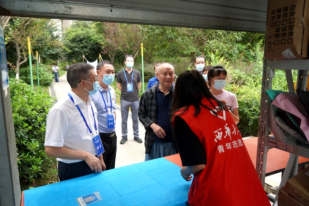 来到西华苑北苑西门,余孝其一行详细询问每天进出苑区人员情况,叮嘱党员志愿者要支持参与配合物业工作人员严格按照学校疫情防控工作要求加强门卫管控,把好“疫情防控第一关”。在西华苑中庭,余孝其向坚持为西华苑教师提供蔬菜水果等物资供应的校友廖凤光询问了解情况,并感谢校友在特殊时期对母校的关爱,希望尽力为师生提供必要生活物资保障,齐心协力,共度难关。