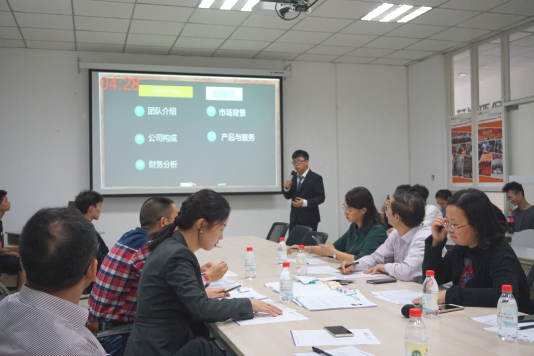 在主持人介绍完11个参赛团队及答辩流程之后,答辩正式开始。此次答辩以“5+5”的形式开展,即团队5分钟的现场答辩和评委5分钟的提问环节。答辩中,每个团队负责人就自己项目的市场调研、发展阶段及未来规划等方面展开详细的介绍。之后,评委们根据每个项目的具体情况提出相关问题,如:项目发展的可持续性,成本资金以及规模的考虑等问题。