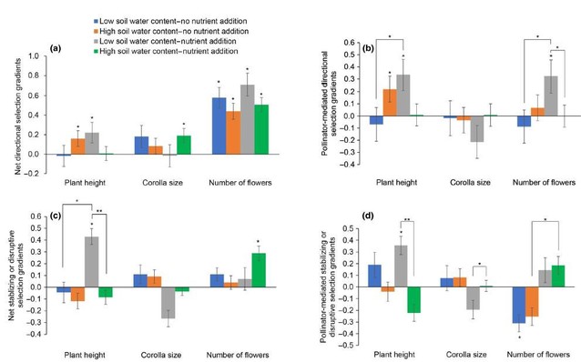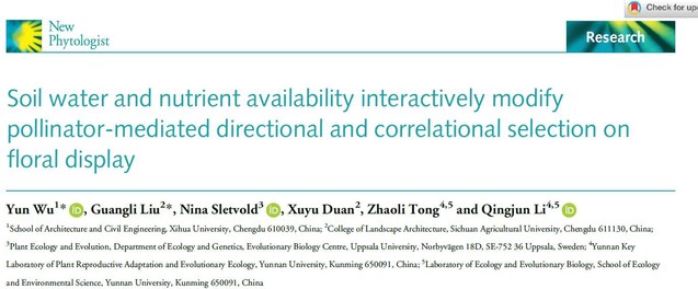 近日,建筑与土木工程学院吴云副教授在New Phytologist(中科院一区,IF=10.323)发表题为“Soil water and nutrient availability interactively modifies pollinator-mediated directional and correlational selection on floral display”的研究论文。