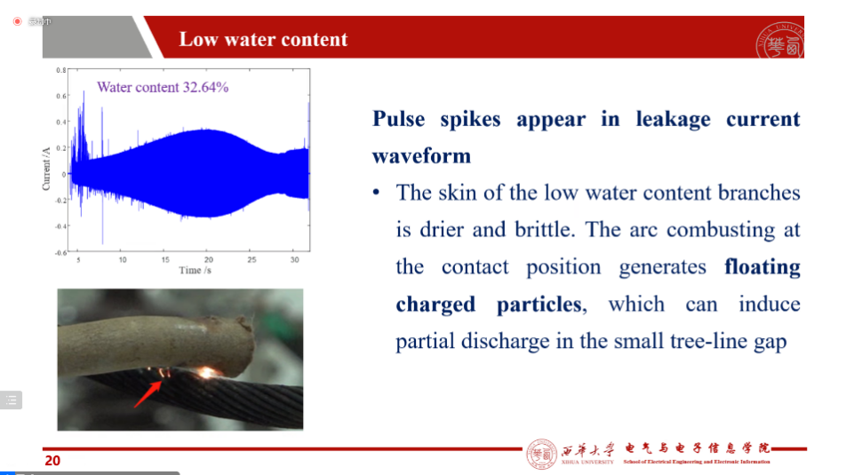来自西华大学的王棣生老师研究了传输线路中的树线接触单相接地故障下的植被引燃过程,此类接触故障发生时,植被含水量是其引燃过程发展的重要影响因素。通过与高温碳化过程结合,分析不同含水量情况下泄漏电流的变化波形。该研究对此类故障的诊断与检测有重要指导意义。