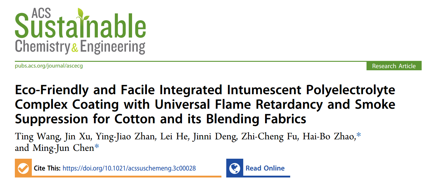对混纺织物表面进行阻燃处理是最常用的阻燃方法,发展绿色环保、操作方便的涂层阻燃技术是当前研究的热点。陈明军教授课题组致力于发展基于水相的环保型聚电解质凝聚体阻燃技术,汪婷博士等人在此基础上研发了以生物质和水处理剂为原料的环保型聚电解质凝聚体,通过pH调控可两步获得透明阻燃涂层,对棉织物、涤/棉二元混纺织物和涤纶/维纶/棉三元混纺织物均可实现阻燃,其极限氧指数值高达27.5%~28.5%,总释放烟气抑制率高于40%。该涂层阻燃技术不仅绿色环保、操作简单,还表现出一定范围的阻燃普适性,被发表在化学领域TOP期刊ACS Sustainable Chemistry & Engineering上,DOI: 。