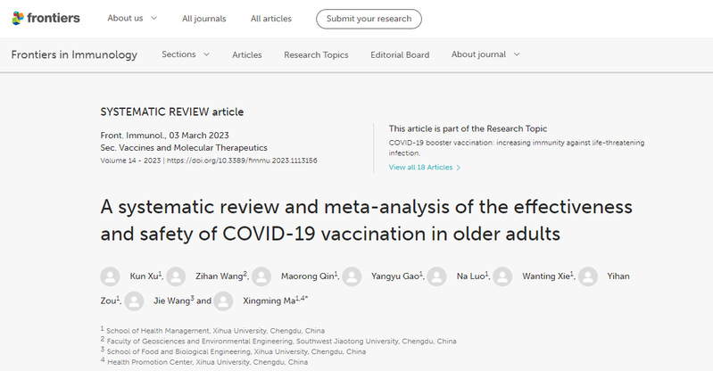 近日,大健康管理学院卫生检验与检疫专业2020级本科生许坤为第一作者、马兴铭教授为通讯作者的论文“A systematic review and meta-analysis of effectiveness and safety of COVID-19 vaccine in older adults”在线发表于免疫学Top期刊《Frontiers in Immunology》(JCR Q1区,IF=8.786)。
