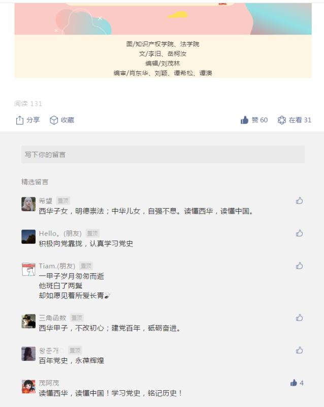 各二级关工委于4月上旬将作品上报校关工委参加评审,并将“读懂中国”作品以线上、线下结合的方式融入到本单位开展的党史学习教育中,进一步发挥“读懂中国”作品的育人作用。截止4月28日的统计数据显示,共计1.8万余名同学通过学院易班网、各二级单位党建工作微信群等平台阅读征文、观看微视频和短视频。广大同学被征文和视频中老党员们的入党故事所感动,留言纷纷表示,将学习老党员们的高尚品格和奋斗精神,不忘初心、牢记使命,努力创造出属于新时代中国青年的精彩人生。