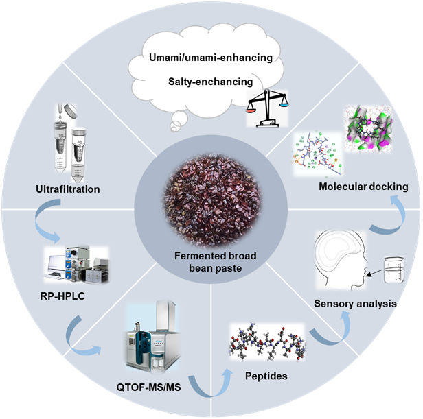郫县豆瓣是我国著名的传统调味品,其发酵过程可分为前发酵和后发酵,前发酵又称甜瓣子发酵。甜瓣子(蚕豆瓣)发酵是郫县豆瓣发酵过程中重要的过程之一,它决定了郫县豆瓣的风味和产品质量。之前的研究表明,游离氨基酸、有机酸和还原糖等物质在发酵蚕豆瓣的风味系统中起重要作用,而最近的研究结果表明,鲜味肽也有助于发酵蚕豆瓣的风味,然而发酵蚕豆瓣中鲜味肽的呈味机制尚不清楚。