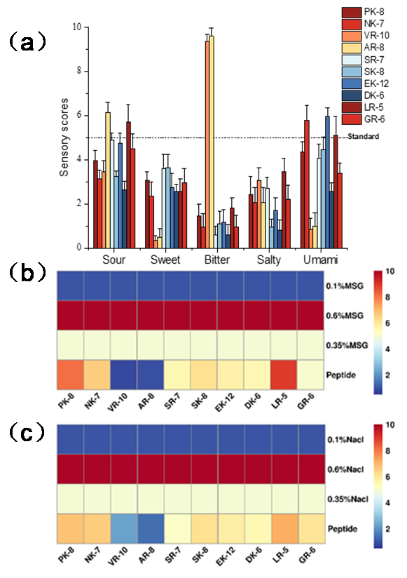 Figure 2. Taste characterization of synthetic peptides. (a) Tasteprofile of umami peptides. (b,c) Umami and salty enhancementevaluation of synthetic peptides.