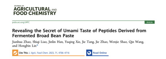 近日,西华大学食品与生物工程学院“发酵调味品科学与工程”团队在美国化学学会(ACS)旗下的农林科学领域国际顶尖期刊《Journal of Agricultural and Food Chemistry》(Q1, IF:5.895)发表题为“Revealing the Secret of Umami Taste of Peptides Derived fromFermented Broad Bean Paste”的研究性论文,且被选为正封面(Front Cover)论文。西华大学2020级硕士研究生赵建华为论文第一作者,林洪斌副教授为论文通讯作者。该研究工作得到了四川省科学技术厅重大专项项目(2020YFN0151)和重庆市科学技术委员会(cstc2021jscx-cylhX0014)的资助。